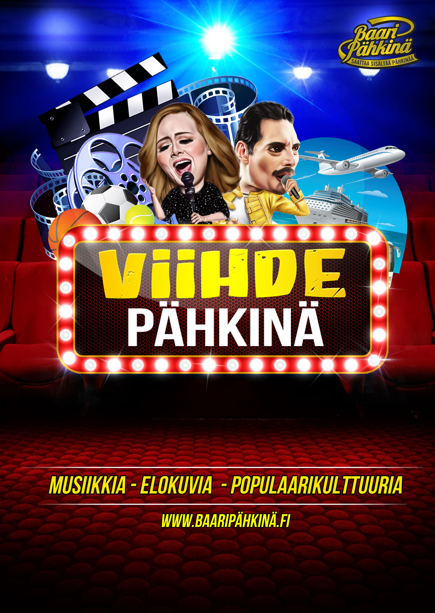 Viihdepähkinä on uudenlainen koko kansan visailu joka esitetään näyttävästi ravintolan screeneiltä, muhkean äänentoiston kera! Mukana on monipuolisesti kuvia, musiikkinäytteitä, leffoja ja laajasti viihdyttäviä kysymyksiä populaarikulttuurin laidasta laitaan!